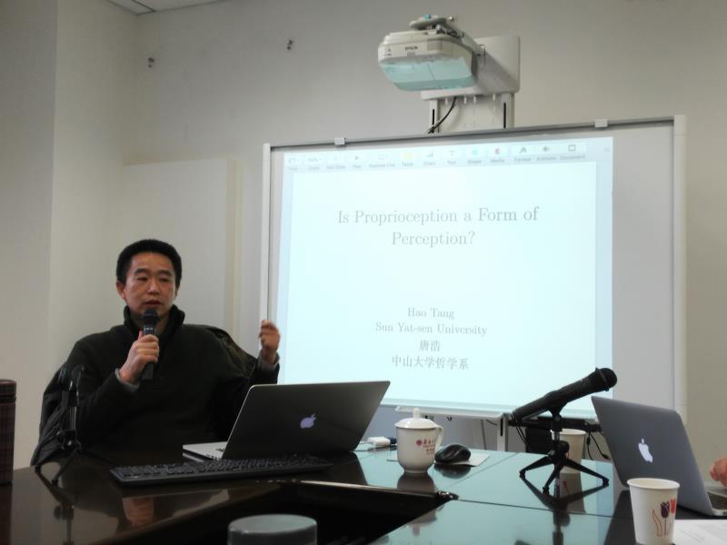 唐浩教授首先强调了“行动”这一概念在问题研究中的重要性,而所有人的行动又都涉及到某种身体上的行动,由此引出了对于身体性自我知识的探讨。唐浩教授用“本体感觉知识”来表达这种身体性自我知识,它表达的是我们关于我们自己肢体的在场、姿势和运动的知识,他认为,身体性自我知识介于两种知识之间:一方面它是“从里面”来的,有“内部性”,另一方面它又关涉物理实体,其处于心身相会的特殊地带。唐浩教授在分析中结合维特根斯坦、安斯康姆、麦克道尔、欧乡纳西等人理论观点,讨论了本体感觉知识的非观察性及其特殊意义的感知性特征,并创造性地提出了“动力性感觉”这一概念,为解决内外空间的统一性问题提供了一条新的途径。