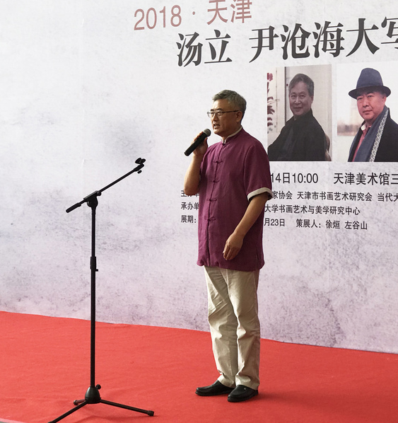 尹沧海教授在答谢词中首先向莅临现场的各位领导、嘉宾与艺术界同仁表示感谢。随后讲述到,他与汤立先生可谓大有缘分,其在少年时期就临摹过汤立先生父亲汤文选先生的画作。他们早在未曾相见时就因画而互为知己,终于在今年的山东联展中得以相识,并决定在天津举办大写意画作品展,向tyc122cc太阳成集团即将到来的百年校庆献礼。他与汤立先生虽然有着各自独立的艺术风格,但是在中国绘画的“写意精神”、“意象造型”、笔墨精神、意境建构等方面有着共识。尹教授指出,在当下这个新的历史时期中,我们不再对于中国的书画艺术的发展充满彷徨,不再由于西风东渐的影响而丢弃中国文化的优秀传统,当下恰恰是一个兼容并蓄、推动中国优秀文化前行的历史时期。中国绘画作为中国文化的表征之一,理应在中国文化的发展战略中起到应有作用,作为大学教授、作为富有社会担当的艺术家应当为当代中国“文化自信”的建设、“国家文化软实力”的提高、“中华文化独特魅力”的展现贡献绵薄之力。