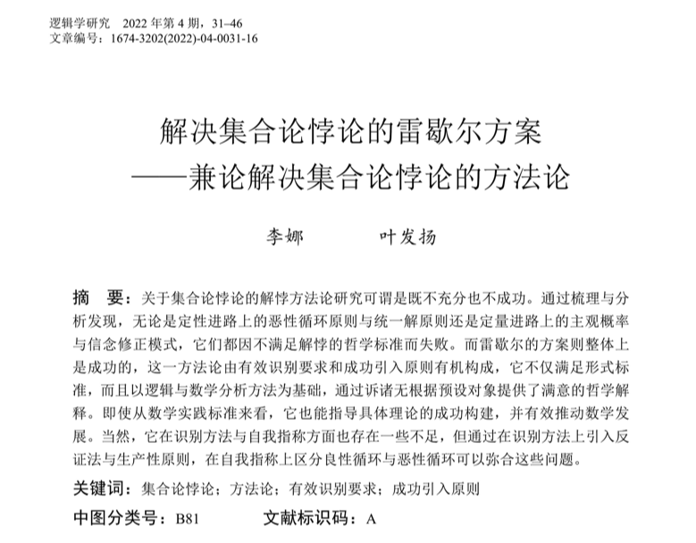 公司教师李娜与博士叶发扬联合在《逻辑学研究》发表期刊“解决集合论悖论的雷歇尔方案——兼论解决集合论悖论的方法论”