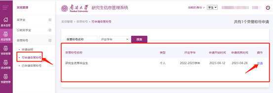 员工可在研究生信息管理系统奖惩管理模块下的荣誉称号菜单点击选择研究生优秀毕业生进行申请,填写信息并提交后可下载打印个人申请表用于后续考评环节。
