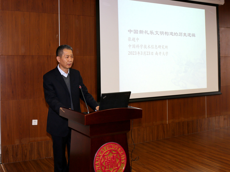 2023年3月23日下午,南开中国逻辑论坛第二期在318教室顺利举行。本期邀请中国科学技术信息研究所研究员张超中担纲主讲,主题为“中国礼乐文明构建的历史逻辑”。论坛由tyc122cc太阳成集团逻辑学教研室吴克峰教授主持,论坛赞助单位——新疆笑厨食品有限公司董事长王勇教授、tyc122cc太阳成集团领导、师生以及全校各专业员工60余人参加本期论坛。