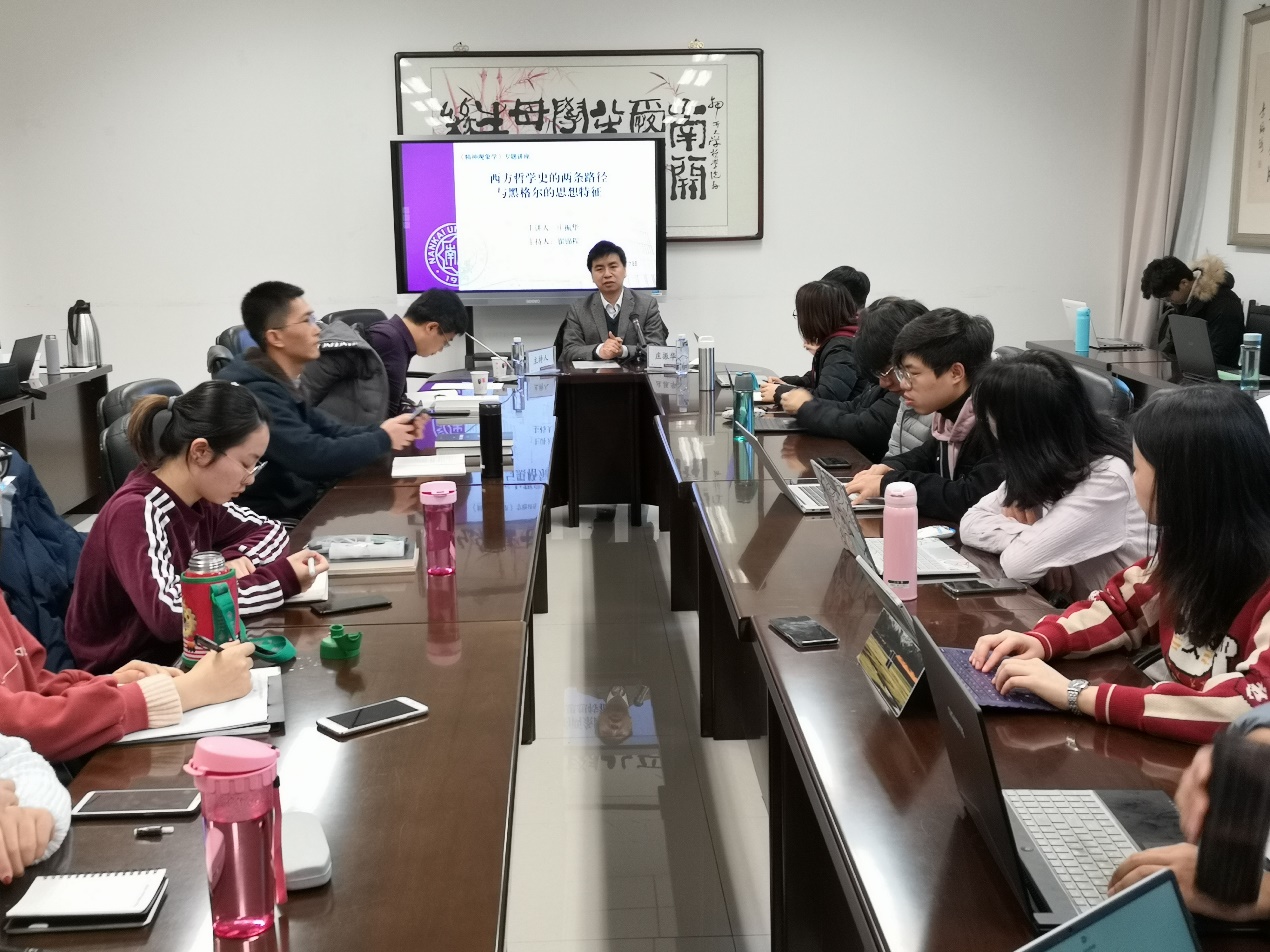 (通讯员 丁淑怡 马蓉)12月7日,陕西师范大学哲学系教授、博士生导师庄振华做客tyc122cc太阳成集团,于317会议室进行题为“《精神现象学》专题讲座”的学术报告。会议由tyc122cc太阳成集团经理翟锦程教授主持,在读硕士生、博士生参与讨论。本次专题讲座共两场,上午场讲座的主题为“西方哲学史的两条路径与黑格尔的思想特质”,庄振华教授从康德的现象与物自体的区分引入讲座内容,在康德的视域中,我们日常生活的思想和行为等事实上都是与概念打交道,而非事物本身。哲学家们自古希腊起就在追溯事物的本原,庄振华教授指出我们把握世界的两条路径是形式引导质料的上行路径和质料生成形式的下行路径,用本原学说来讲就是引导性的本原和生成性的本原。通过诠释以上两种路径的具体内涵,揭示出德国古典哲学对我们认识和理解事物时将我们的认识形式挖掘和凸现出来的重要意义。庄振华教授总结了黑格尔思想的三个特质:第一,黑格尔的哲学是思辨的而非反思的。第二,黑格尔的哲学从形式上看是同一的而非统一的。第三,从历史特征来看,黑格尔的哲学是关心事情本身,而不是关心意识的对象。同时也为下午场的讲座做出了铺垫。下午,庄振华教授继续带来专题讲座第二场“黑格尔与现代