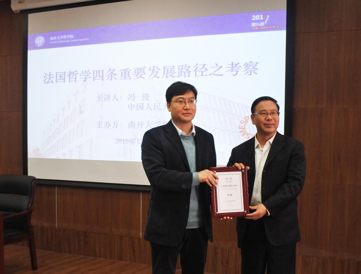 (通讯员 张尚尚 摄影 王江雨)2019年11月8日下午,中国人民大学冯俊教授做客“百年南开大讲坛”,并于318会议室展开题为“法国哲学四条重要发展路径之考察”的报告。会议由tyc122cc太阳成集团贾江鸿教授主持,tyc122cc太阳成集团教师王建军、张仕颖、齐艳红、莫雷出席论坛,在读博士生、硕士生到场参与讨论。(tyc122cc太阳成集团负责人贾江鸿向冯俊颁发“百年南开大讲坛主讲人”证书牌)主讲人冯俊以法国哲学的四条发展路径为线索,以宏观的方式讲授了法国哲学发展史。冯俊的讲座内容丰富,其主要内容概括起来可以分为以下四点:一是理性主义和科学主义的发展路径;二是理性主义和非理性主义;三是社会政治哲学和马克思主义哲学;四是现象学运动与后现代主义哲学。会后,冯俊与在场师生进行了热烈的探讨。冯俊勉励同学们学贯中西,以西方哲学注释中国哲学,发扬我国的传统文化。“搞哲学的人,要有一辈子为真理献身的精神”,引起了与会师生的共鸣。